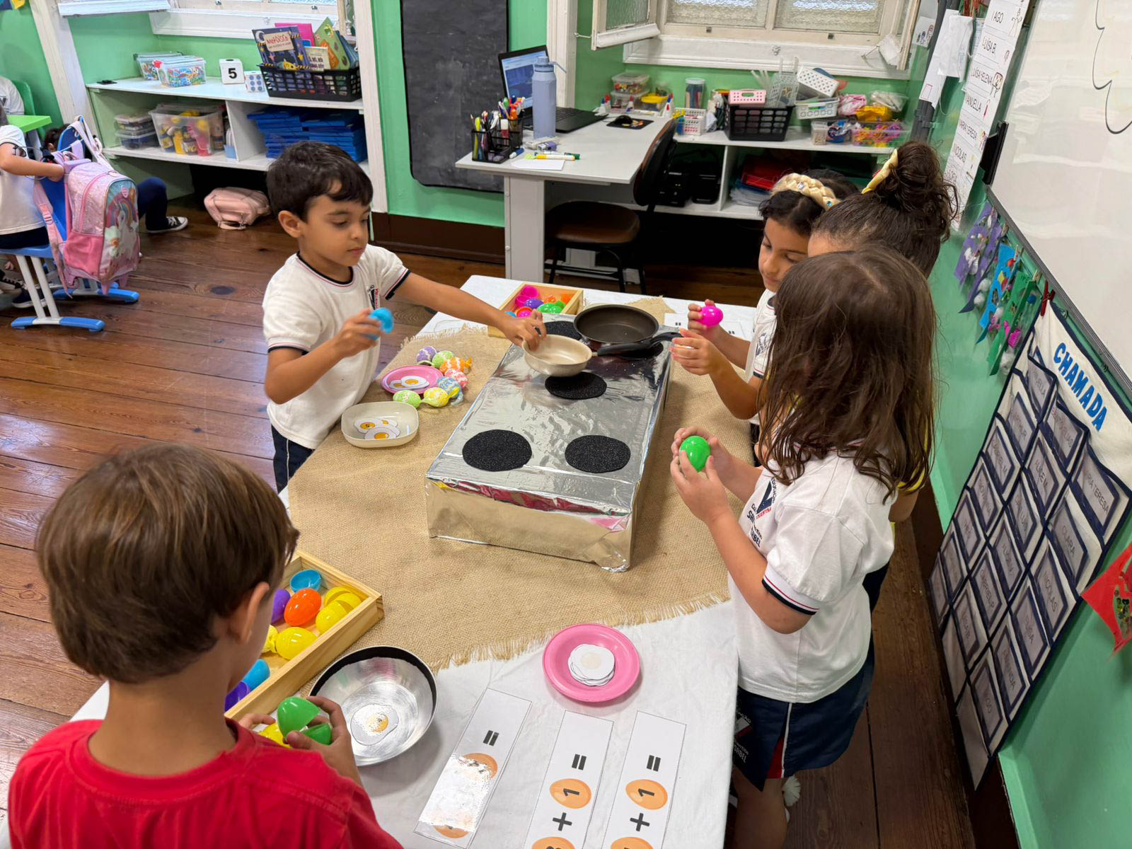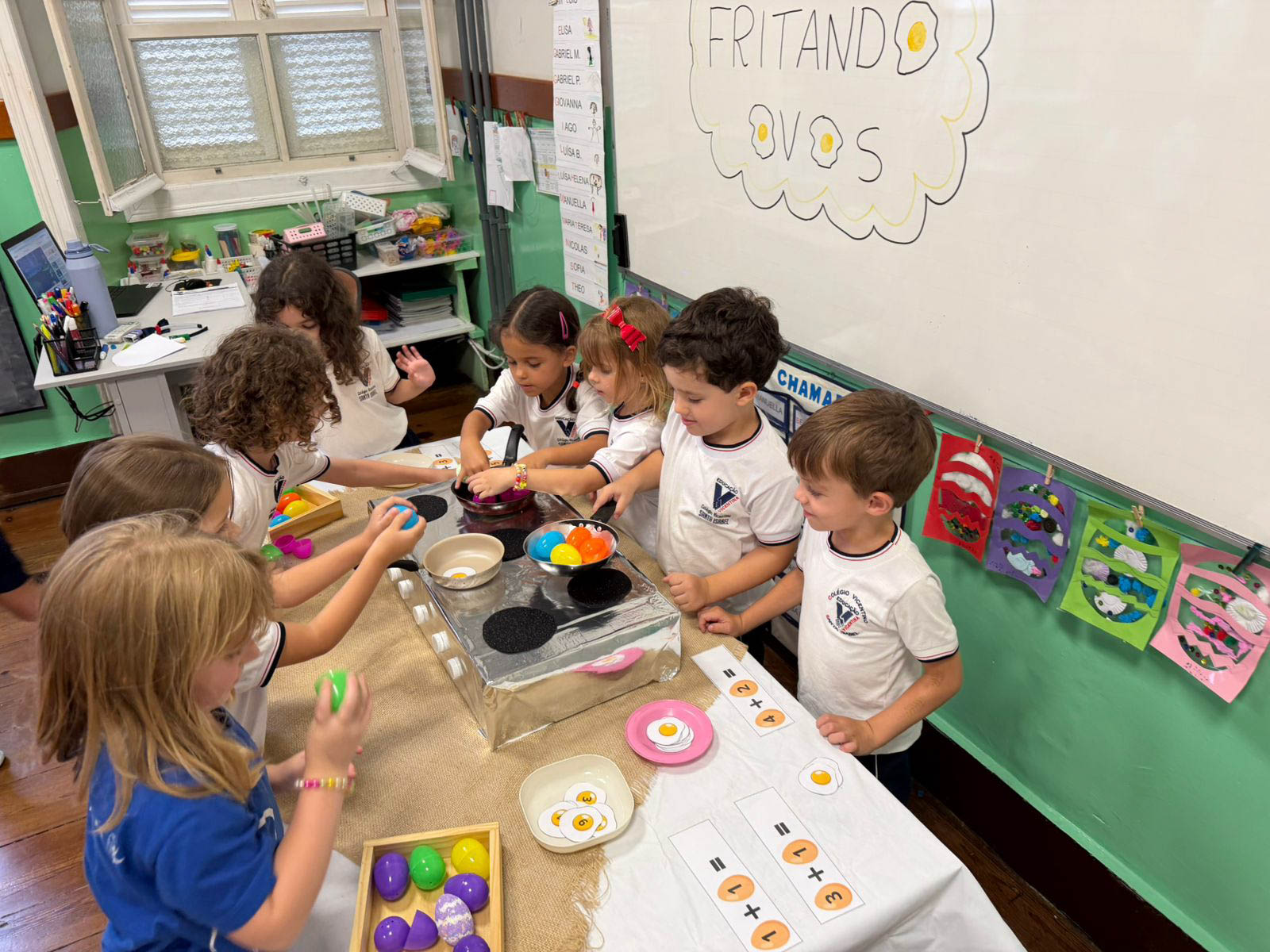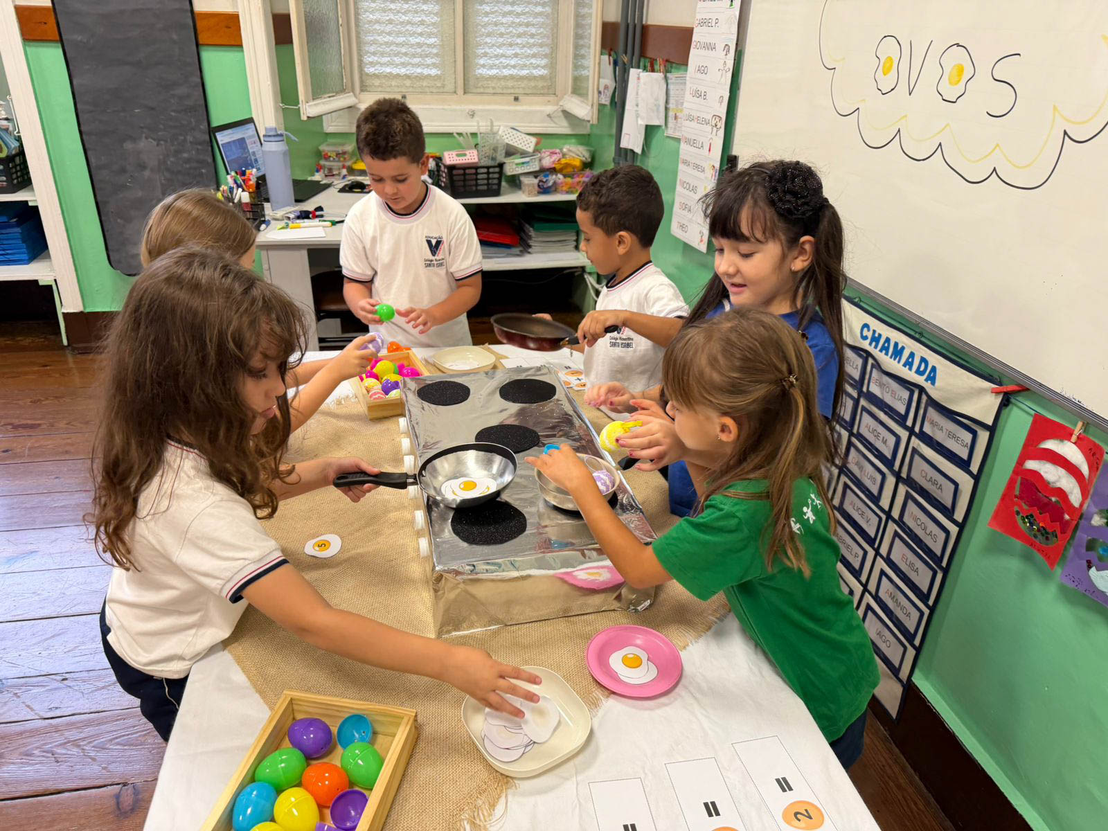 Entre vivências e brincadeiras encantadoras, participaram de atividades como fritar ovos, a divertida corrida do ovo na colher, a confecção de ovos coloridos, experiências com receitas e uma animada caça aos ovos.